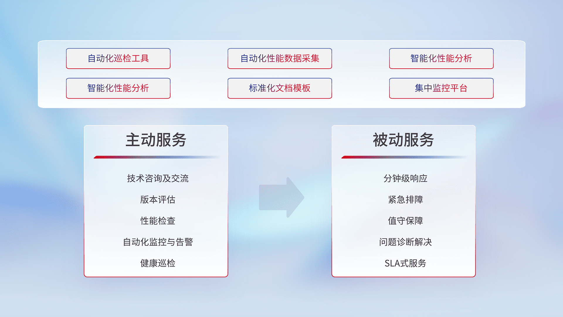 智能化工具和标准化文档,,,保障服务质量,,提供主动服务(包含技术咨询、、版本评估、、、性能检查、、自动化监控与告警、、、、健康巡检)和被动服务包含(分钟级响应、、、、紧急排障、、值守保障、、、问题诊断解决、、、SLA服务)。。。