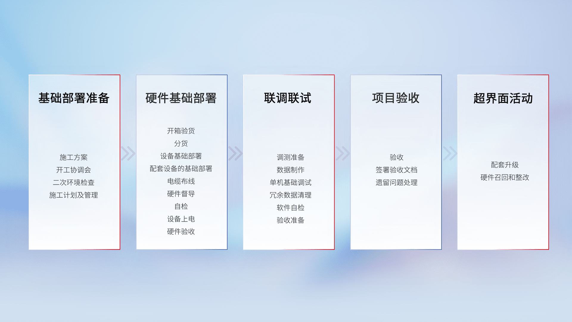 从基础部署准备、、、、硬件基础部署、、、联调联试、、项目验收、、越界面活动的全过程可追溯,,,,保证施工质量和进度。。